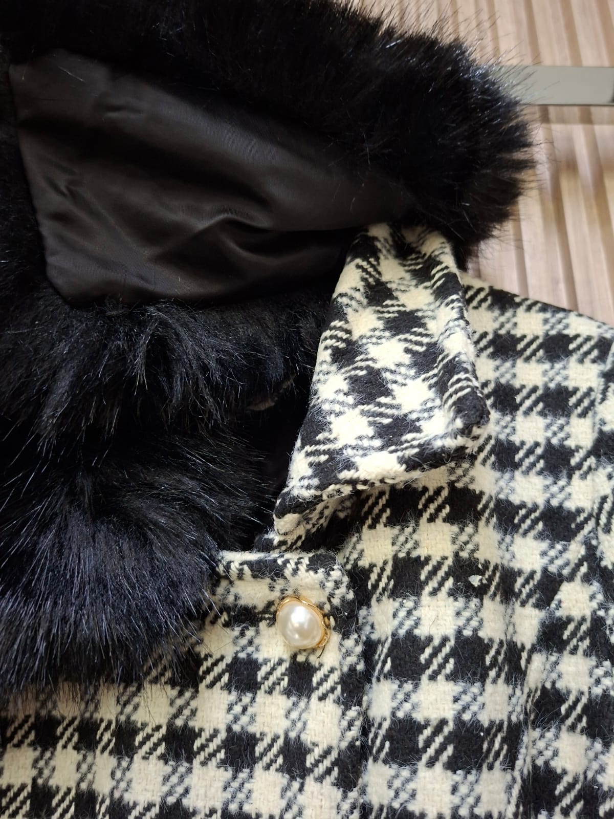 ✨ Elegancia Clásica: Abrigo Cuadros Café con Cuello de Peluche Negro ✨