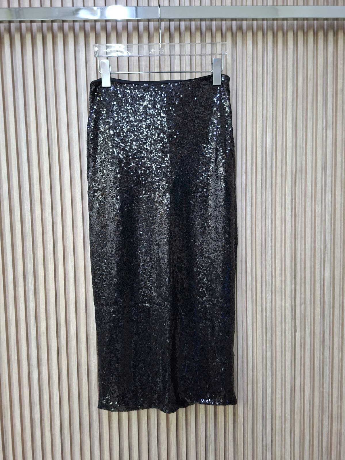 Falda de tubo confeccionada en tela cubierta de lentejuelas que capturan la luz con cada movimiento. Su diseño ajustado realza la silueta mientras mantiene comodidad en la cadera y muslos. Perfecta para noches especiales, cócteles y celebraciones donde deseas destacar. La combinación de brillo y elegancia la convierte en una pieza versátil que funciona tanto con tops sofisticados como con blusas minimalistas. Un básico glamuroso que eleva cualquier look festivo.