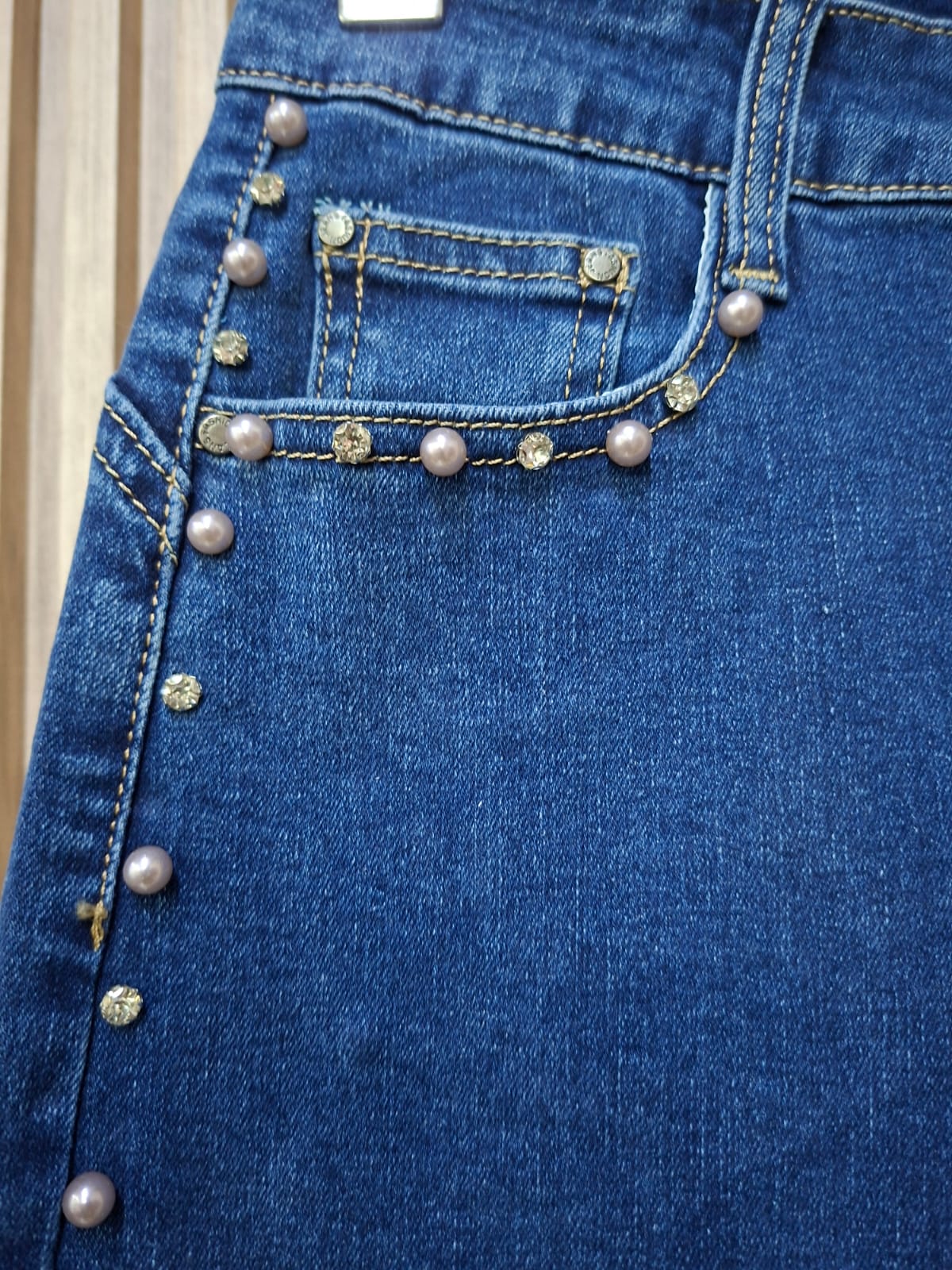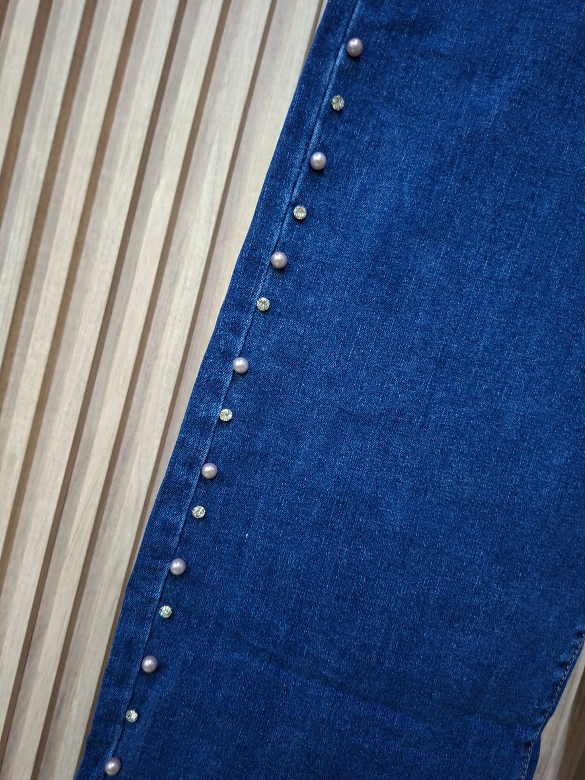 Pantalón DF175 en mezclilla oscura con detalles de estoperoles y perlas que elevan tu estilo. Diseñado con bolsas funcionales amplias y corte recto que favorece la silueta. Disponible en tallas 3-13, perfecto para cuerpos petit y curvy. Esta pieza versátil combina comodidad y tendencia, adaptándose a cualquier ocasión. Tela de calidad que mantiene su forma y color tras múltiples lavados. Un básico moderno que se convierte en protagonista de tu guardarropa.